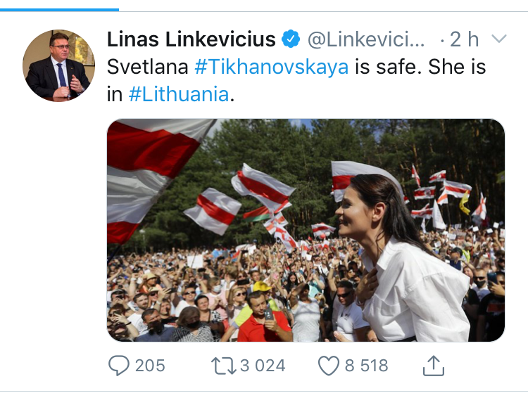 Litvanya Dışişleri Bakanı Linas Linkevicius Twitter hesabından yaptığı açıklamada Belarus muhalefet lideri Svetlana Tichanovskaya’nın Litvanya’da ve güvenlikte olduğunu duyurdu.