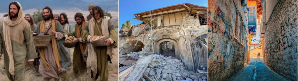 The documentary’s second part begins with a view of the Abu Najjar mosque, which was largely destroyed in the recent earthquake. From various angles, we see the mosque in ruins. Among the ruins, the presenter tells the story of the Apostles’ friendship with Abu Najjar, a carpenter from Antioch, how Abu Najjar’s leper son was cured by the Apostles, and the conversations between Habibi Najjar, Barnabas, and Paul.