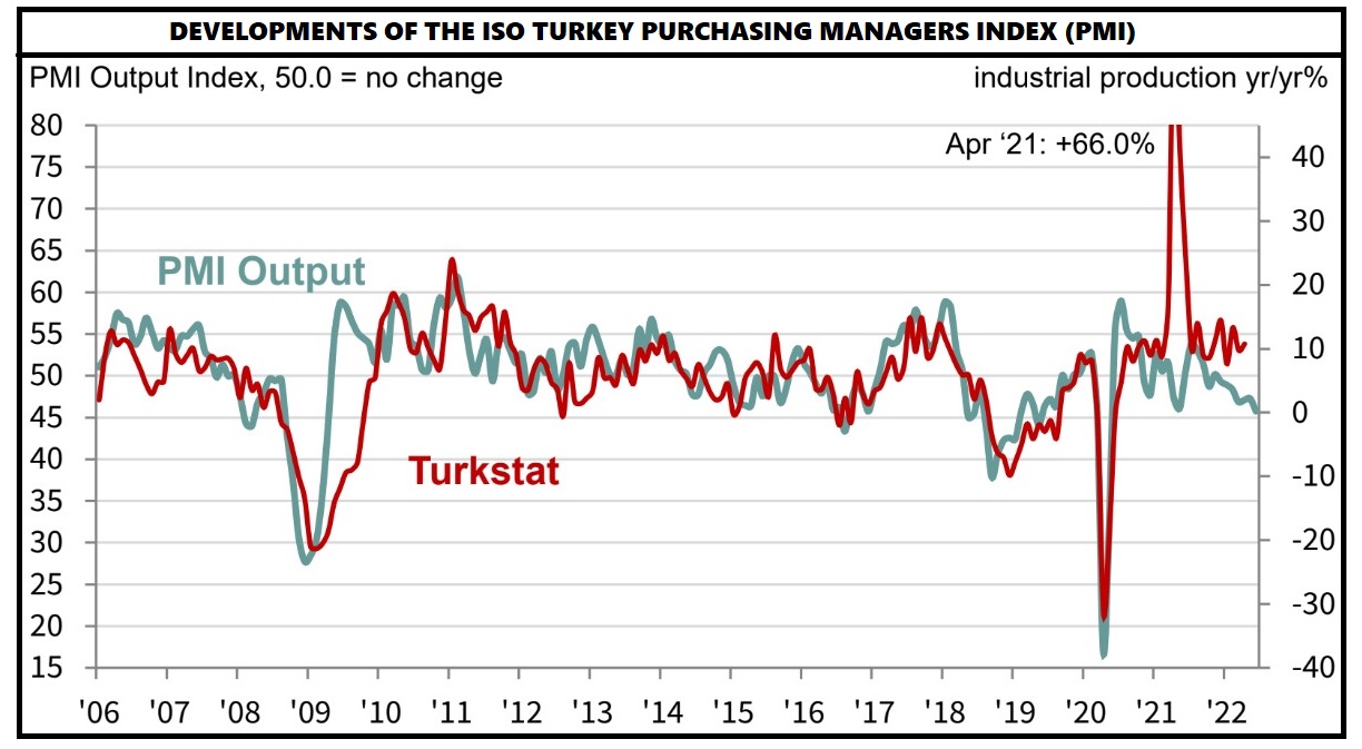 At 48.1 in June, down from 49.2 in May, the headline PMI signalled a moderation in the health of the Turkish manufacturing sector and one that was the most marked since the initial wave of the Covid-19 pandemic in early 2020.