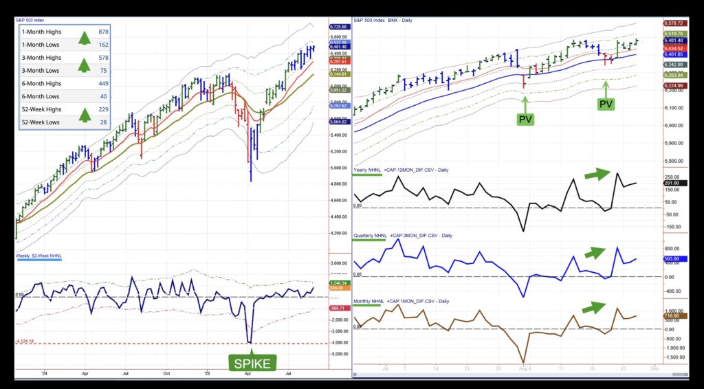 The New Highs continued to expand, the New Lows to shrink. Our New High – New Low Index continued to rise in all for windows that we track. Notice the pattern of higher highs of NHNL, marked by green arrows; it confirms that bulls are in control.