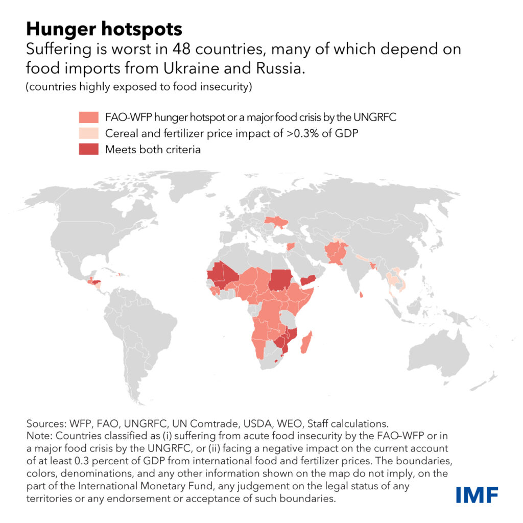 “The impact of the food shock is felt everywhere. The suffering is worst in 48 countries, many highly dependent on imports from Ukraine and Russia—mostly low-income countries. Of those, about half are especially vulnerable due to severe economic challenges, weak institutions, and fragility.”