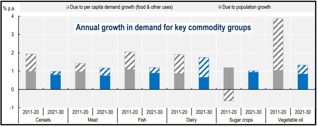 Whilst addressing the immediate problems, the global community should not lose sight of the need to work towards achieving the 2030 Agenda and the Sustainable Development Goals (SDGs). According to the Outlook, global food consumption, which is the main use of agricultural commodities, is projected to increase by 1.4 percent annually over the next decade, and to be mainly driven by population growth. Most additional demand for food will continue to originate in low- and middle-income countries, while in high-income countries demand will be limited by slow population growth and a saturation in the per capita consumption of several food commodity groups. Diets in low-income countries, however, will likely remain largely based on staples and food consumption will not increase sufficiently to meet the Zero Hunger target by 2030.
