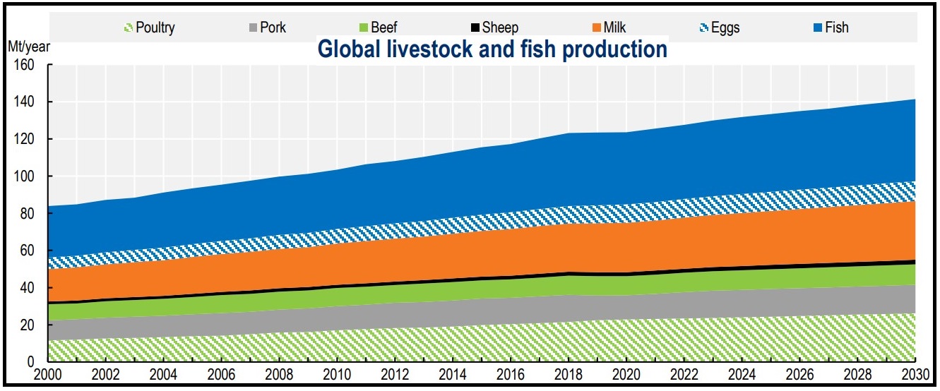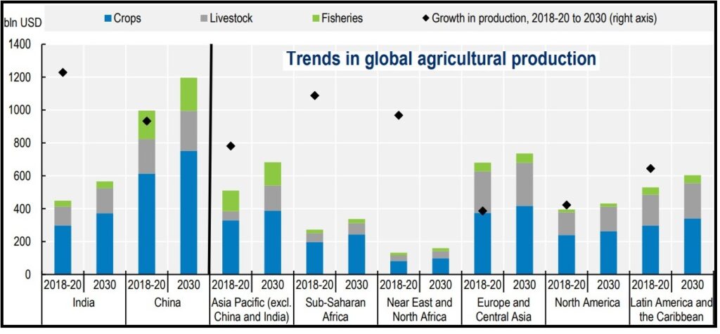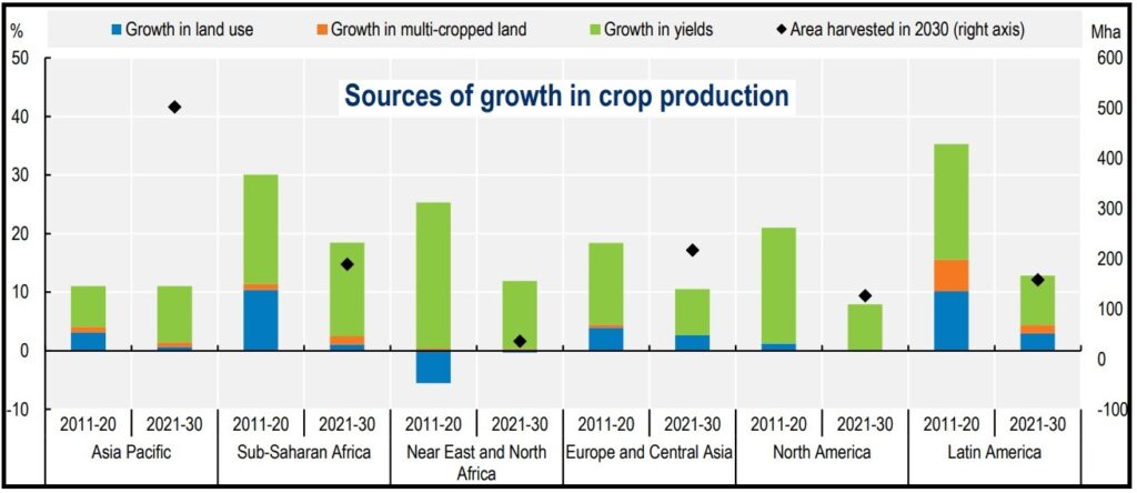 Over the next decade, global agricultural production is projected to increase by 1.1 percent per year, with the additional output to be mainly produced in middle- and low-income countries. The Outlook assumes a wider access to inputs and shows that increased productivity-enhancing investment in technology, infrastructure and training will be critical drivers of agricultural growth. However, a prolonged increase in energy and agricultural input prices – such as fertilisers – will raise production costs and may constrain productivity and output growth in the coming years.