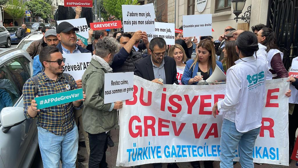 Türkiye Gazeteciler Sendikası (TGS) üyeleri, gazeteciler ve siyasi parti temsilcileri AFP’nin İstanbul Şişli’deki ofisi önünde toplandı. AFP ofisinin yer aldığı binaya “Bu işyerinde grev vardır” pankartı asıldı ve davul-zurna çalınarak grev halayı çekildi.