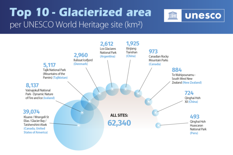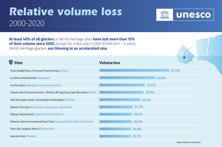 UNESCO’nun Dünya Doğa ve Doğal Kaynakları Koruma Birliği (IUCN) ile ortak yayınladığı raporda iklim değişikliği gözleminde öncü olan buzulların her yıl 58 milyar ton buz kaybettiği ve küresel deniz seviyesindeki artışa yüzde 5 katkıda bulunduğu açıklandı.